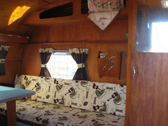 They purchased their camper last summer…. since then she was given some new birch, new laminate, new sub floor and tile, new cushions, curtains, a ton of polishing of aluminum, made the wings and gave her an exterior paint job!!